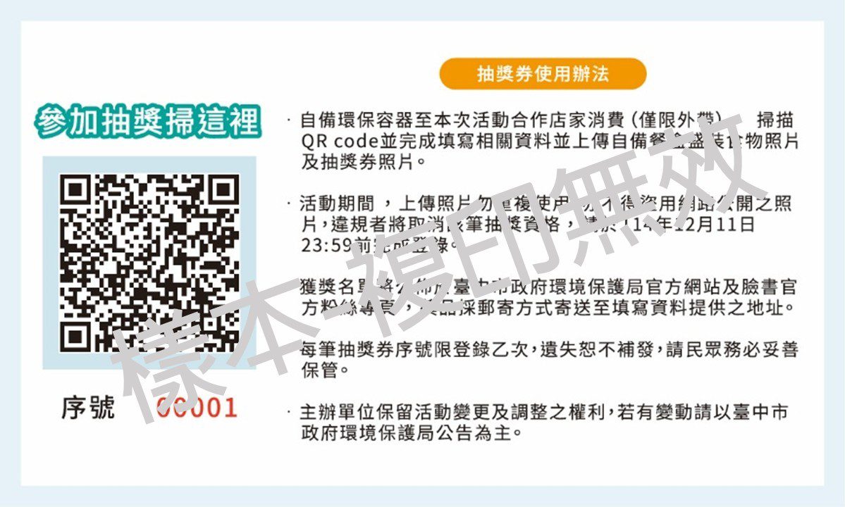環保局表示,台灣外食文化盛行,外帶便利性提高生活效率,也增加免洗餐具垃圾量及環境負荷。為鼓勵民眾像源頭減量於日常用餐培養「自備、重複、少用」綠消費環保行動,期透過「自備誘因」鼓勵民眾自備習慣,逐步減少一次性用品的使用。此次活動結合餐飲業合作店家,民眾只要自備環保餐盒至合作店家消費外帶盛裝餐點,即可享有每份便當自備享折扣10元及贈送抽獎券1張(上述數量皆有限,送完為止),另部分店家自主提供自備優惠(如現金折扣、餐點加量或集點等多元優惠,依活動公告為準)。此外,於活動期間掃描抽獎券QR Code( https://reurl.cc/8b2qWM )並上傳自備容器盛裝食物照片、抽獎券照片及完成登錄,即有機會參加抽獎!