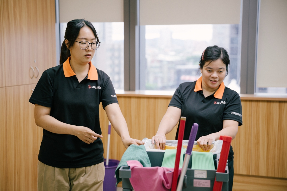 清潔工作隊的工作職場屬於開放式環境,在不同社區空間與機構內提供清潔及環境維護服務。工作內容涉及工具使用、流程拆解、團隊協作及對外應對,對庇護員工而言,這是一段需要耐心學習的過程。