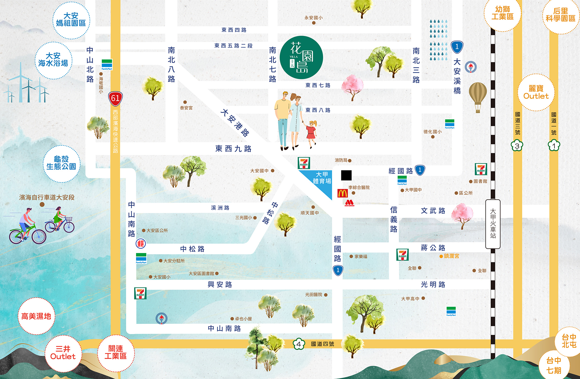 該案位於台中市大安區,周邊生活機能齊全、交通便捷。3 分鐘即可上台 61 線,15 分鐘直通國道 4 號與國道 3 號,南北往來快速便利。生活採買方面,3 分鐘內可達超商,10 分鐘即可到傳統市場及大甲蔣公夜市;教育資源完善,九年國教一站式接送僅需 3 分鐘。休閒方面,5 分鐘可達大安濱海樂園與媽祖文化園區,20 分鐘則可到台中海洋生態館,滿足家庭的休閒娛樂需求。