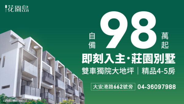 台中海線指標建案「十大花園島Villa」宣布推出限量3席【輕鬆成家優付專案】,以98萬低自備即可交屋入住,大幅降低購屋門檻。凡簽約即贈送知名品牌「櫻花廚具」與「全室輕裝修」,並享有專屬「一畝田」,名額僅限3位,機會難得。