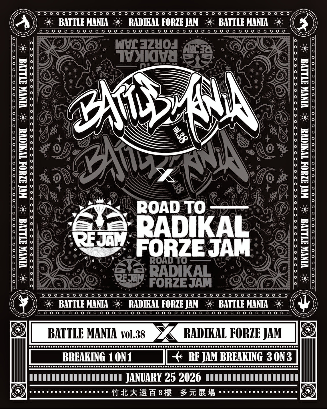 yoo!新竹街舞狂熱又來了!2026年第一個月帶給大家熱血的第38屆街舞狂熱(Battle Mania.38)活動,將於1月25日舉辦在竹北遠百8樓的多元展場,高品質的場地將帶來全新的震撼氛圍。這場街舞活動結合2026 Radikal Forze Jam(RF JAM )國際街舞台灣區域賽,冠軍將於2026年3月14號代表台灣前往越南峴港市參戰,與中國、泰國、馬來西亞、俄羅斯、韓國、新加坡、越南、日本等 一爭高下!歡迎大家一起共襄盛舉這場全國人氣街舞盛會!