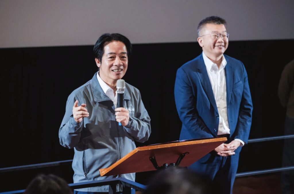 總統賴清德(左)和中華職棒會長蔡其昌(右)分享觀影心得。(牽猴子 提供)
