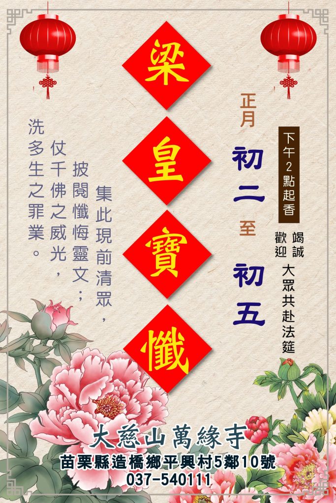 苗栗大慈山萬緣寺將於初二民間習俗回娘家日隆重舉辦梁皇寶懺,截至初五圓滿日!信眾趁年假為己為家人持誦梁皇寶懺是最吉祥如意,添福慧增祥壽。