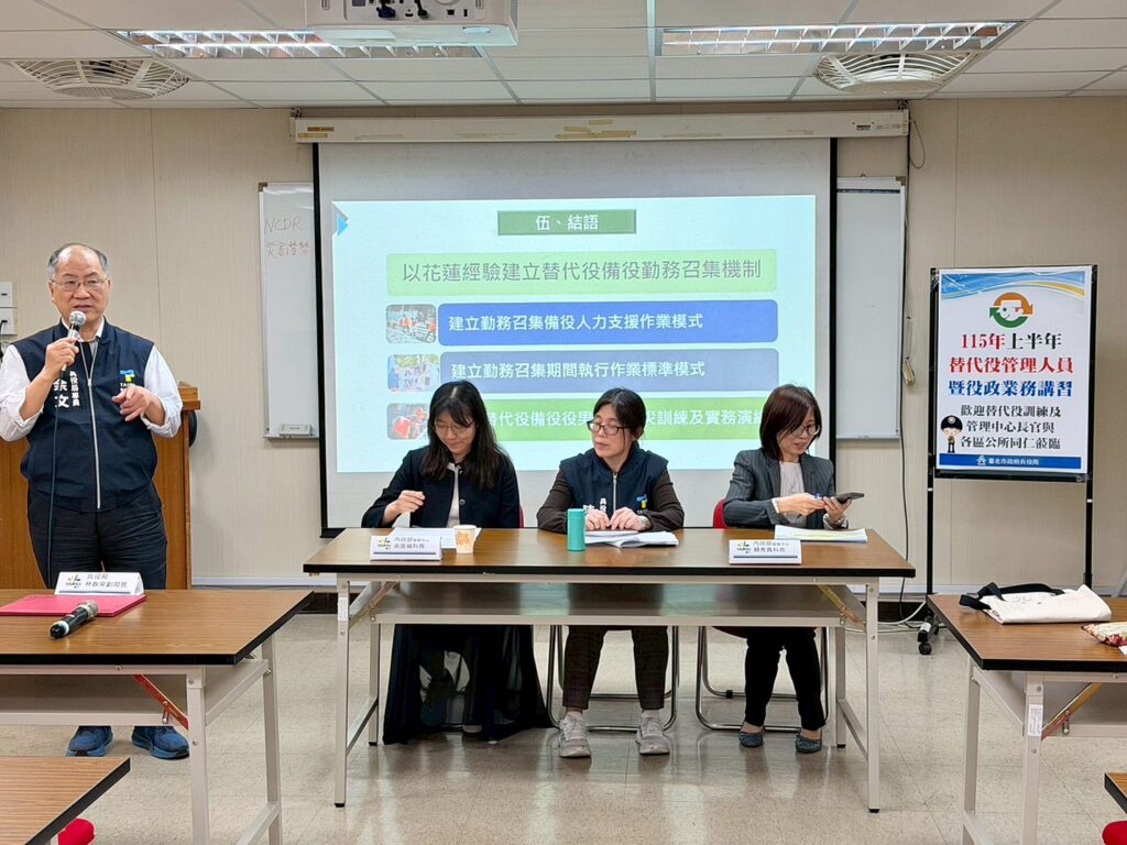 臺北市政府兵役局(十九)日指出,為提升替代役人力運用效能並強化首都防災韌性,兵役局於十八日在替代役中心舉辦「115年上半年替代役管理人員講習」。此次講習邀集全市各區公所及服勤單位業務承辦人員參與,旨在透過專業課程與實務交流,建構更完善的役政管理體系。