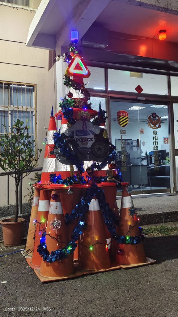 今(25)日是耶誕節,臺南市政府警察局歸仁分局交通分隊為迎接耶誕節及新年到來,除了發揮巧思,在駐地大門內入口處前有株外表獨特的「聖誕樹」,以交通錐、指揮棒、警用肩燈及警示燈等物組成充滿「交通意象」,搭配明亮燈光十分吸睛,充滿濃濃的聖誕年節氣息,讓入內洽公民眾發出會心一笑。