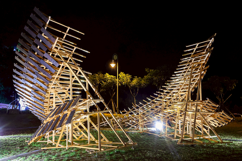來自日本沖繩的藝術家町田隼人,以南島色彩融合地方元素創作《旺旺花花》;印尼藝術家Aji Prasetyo透過駐村期間與居民互動、蒐集生活物件,完成了金屬機械裝置《動能變異》;馬來西亞藝術家朱威龍以台灣水鹿為原型,結合機械動態與光影呈現大型動態雕塑《聽風的鹿》;蘇奕榮與董宇茜運用AI生成筆墨山水,打造可行走的數位山林作品《臺南臺南:從畫卷走入數位夢土—山林篇》。