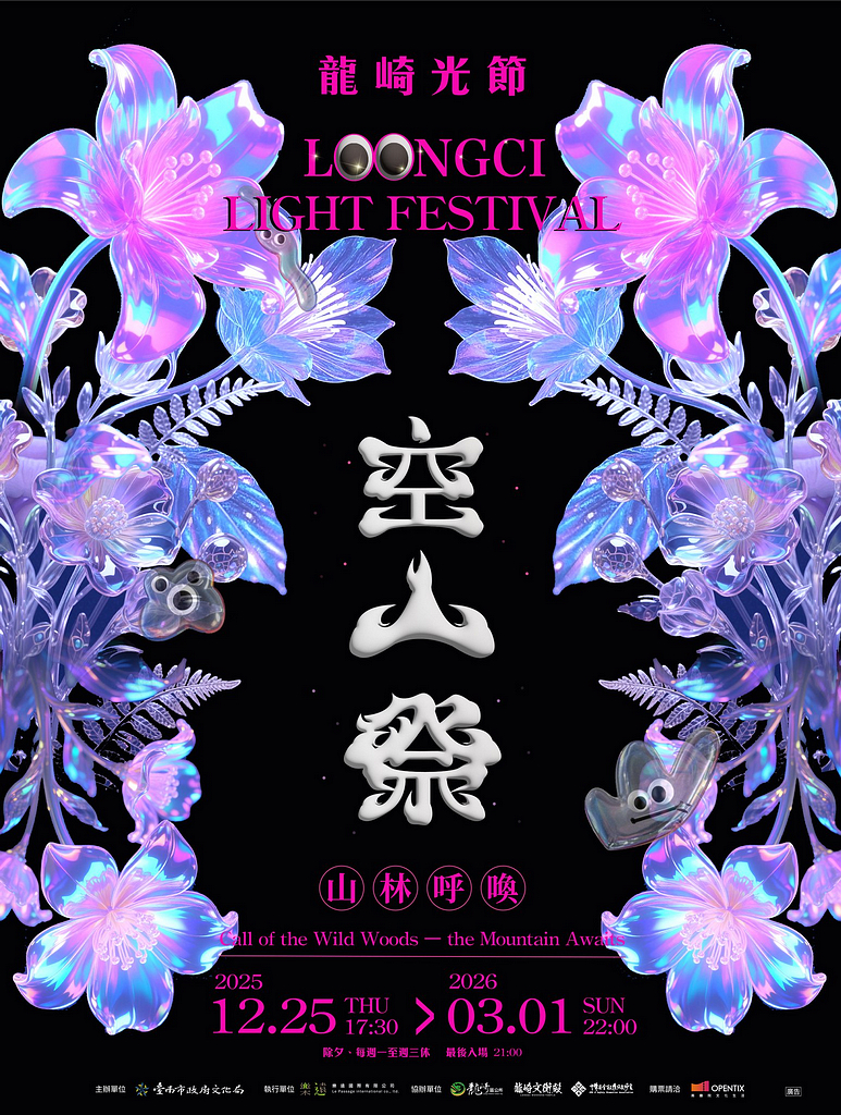 2026龍崎光節 – 空山祭,全國最美山林燈節 2025/12/25 點亮龍崎,今年台南市府邀集多名國內外藝術家駐地創作,以全新主題「山林呼喚、大地蘊行」在虎形山公園打造十四組地景光影,閃爍璀璨精彩直到 2026/03/01 (每週四、五、六、日 17:30 – 22:00,需購票)。