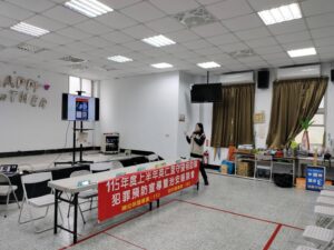 接著藉由播放防空避難宣導影片,提醒使用「警政服務App」或基隆市警察局網站「防空避難專區」查詢防空避難設施標示地點。空襲警報發放時,應冷靜熄滅火源、關閉水電瓦斯,進入地下室、大樓地下停車場等避難處所,注意「二牆法則」遠離玻璃與窗戶,採低跪姿、保護頭部與胸部。