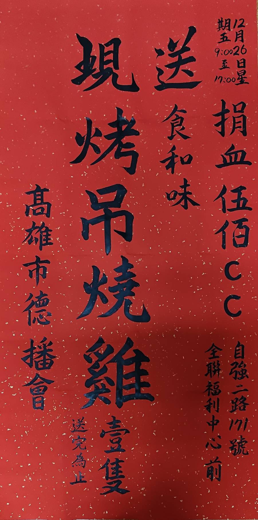 【記者范家豪/高雄報導】 為響應公益捐血、傳遞社會溫暖,高雄市德播會攜手多個公私部門共同舉辦「捐血有愛.德播傳情」捐血活動,訂於114年12月26日(星期五)上午9時至下午5時,將於**頂鮮台南擔仔麵餐廳前(中正、自強路口,交通大隊旁)**溫馨登場,誠摯邀請民眾踴躍參與,以實際行動挽救生命、回饋社會。