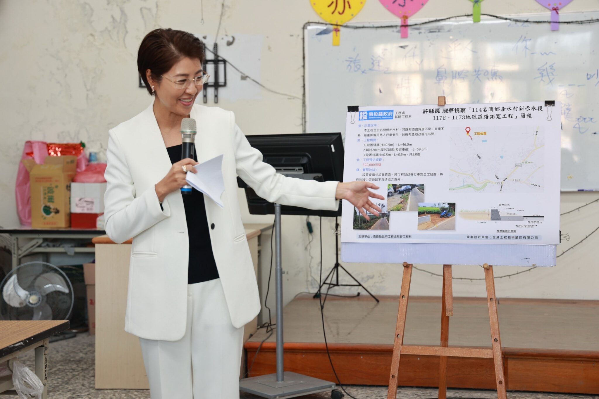 許縣長隨後轉往名間鄉,分別由縣議員林憶如、張秀枝等人陪同,聽取工程簡報。大庄村縣道150線38K+750處,排水溝堵塞影響行車安全,許縣長當場核定25萬元改善。赤水村新赤水段1172、1173地號農路狹窄,地主同意捐地,縣府核定32萬餘元拓寬工程,改善農路通行。