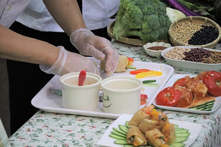 在主廚秀環節中,桃園醫院營養師張芷銘與主廚曾立杰共同研發兩道示範料理。「番轉未來能量盅」以牛番茄作為天然容器,減少加工與包裝使用,內餡搭配雞蛋、毛豆仁與馬鈴薯,兼顧蛋白質與膳食纖維來源,並利用挖出的番茄籽製作莎莎醬,實踐零廚餘理念;「低碳植感捲」則以生豆包取代肉類,搭配小黃瓜、彩椒、芋頭與蘋果等多樣蔬果,提供豐富植化素與纖維,兼顧口感與營養,翻轉大眾對蔬食單調的印象。