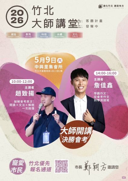 未來「2026竹北大師講堂」也將持續推出系列活動,涵蓋建設、教育、科技、永續及文化五大主軸,並邀請多位指標性講者接力登場。詳情請關注臉書,掌握最新活動資訊。