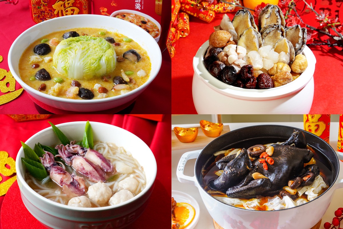 首先在湯品選擇上,建議依風味深淺進行配置,例如同時安排清爽型高湯與風味較為醇厚的燉湯、或是飽足感加倍的羹湯,讓用餐節奏自然轉換。光是雞湯就有晶華酒店的火烔瑤柱燉雞湯清爽鮮美、北投老爺酒店的黑蒜美人燉雞湯風味十足、錦霞樓的胡椒豬肚干貝雞湯溫潤滋補,無論是長輩或年輕族群,都能依喜好自由選擇,提升整桌年菜的接受度與耐吃度。