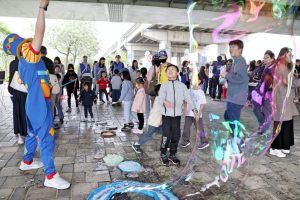 ▲大人小孩開心地一齊觀看泡泡表演。(圖/心路基金會新竹分會提供)
