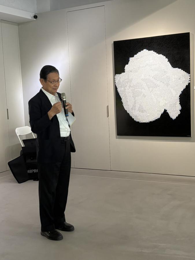 ▲帕莎蒂娜董事長許正吉介紹桑幡紀行於新思惟人文空間個展創作心路。(圖/高婕)
