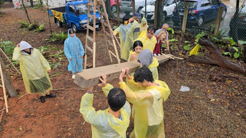 隨後課程走入真實場域,學生於中原大學信實基地周邊展開實地環境整備、場域丈量與基礎建造工作,在泥濘土地與天候變化下進行立柱、撐樁、校正水平與垂直角度、搬運材料、現地調整與施工組裝等任務。即便遇到雨天施工不便,學生仍穿著雨衣持續投入,透過拉繩、扶柱、固定支架等團隊協作,展現高度投入與責任態度。透過此階段的真實施工經驗,學生體會到紙上設計與現場落地之間的差異,學習隨機應變、溝通協調、現場判斷、材料掌控與問題解決能力。課程亦安排木雕與傳統工法學習,學生在工藝師指導下透過雕刻與手作,理解紋飾背後的族群記憶、文化敘事與精神象徵,使文化學習不再停留於理論,而是透過身體勞動與藝術參與建立深層情感連結。透過模型→施工→工藝的學習歷程,學生不僅提升技術能力,也逐漸理解文化內涵如何透過空間與構築被具象化呈現。