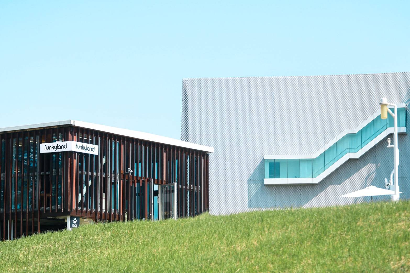 Funkyland坐落於草坡制高點,這種居高臨下且視野開闊的場域,為其提供了獨特的空間張力,是一般鄰里公園難以複製的戰略位置。