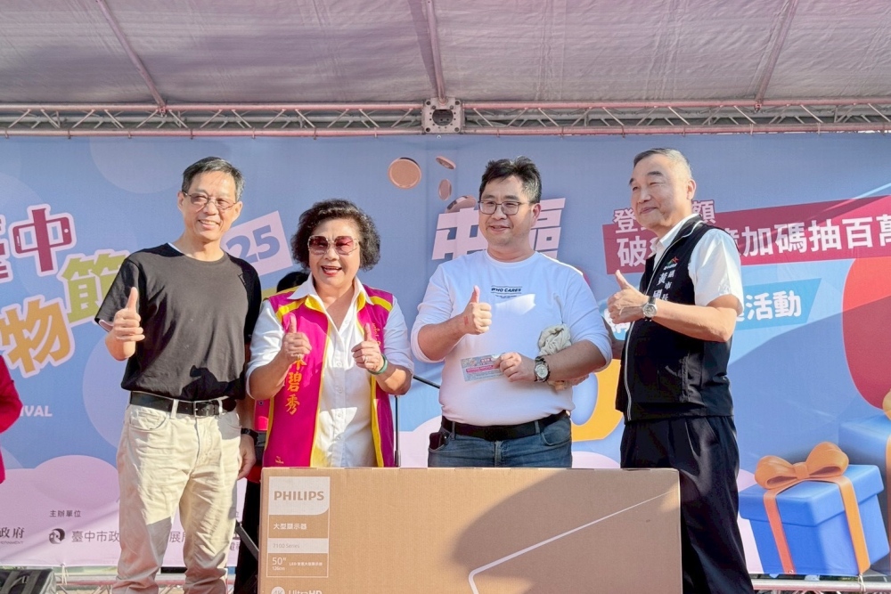 台中購物節起跑第7週,累計登錄金額截至12月6日已達239億元,市府在大里公園舉辦「2025台中購物節-屯區GOGO購」活動,歡慶登錄金額突破200億元,現場由副市長黃國榮抽出百萬現金1名,同場也抽出外籍專屬美金1萬元、天天抽3千元現金等豐富獎項。