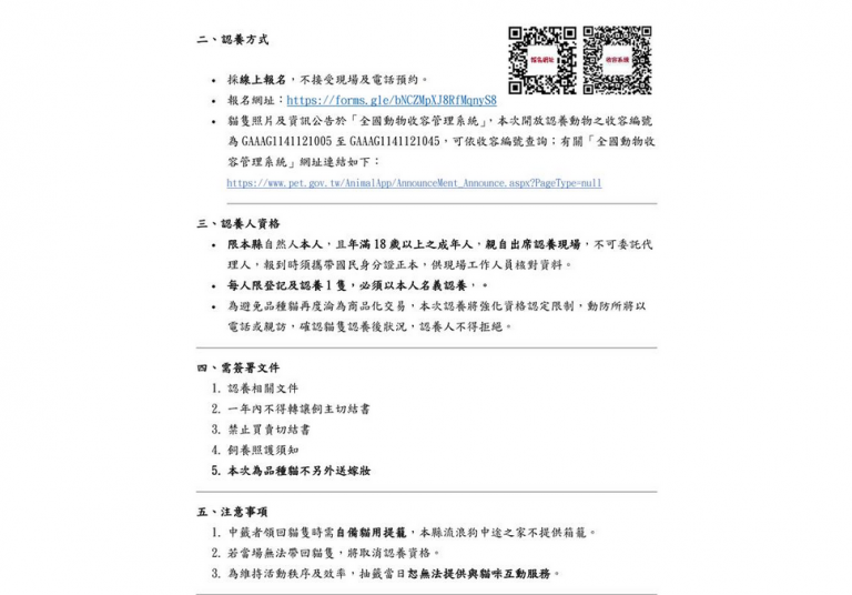 ▲彰化縣動物防疫所日前依法沒入41隻遭不當飼養的品種貓,目前所有貓隻都已完成絕育,健康狀況穩定,將分二梯次以公開抽籤方式提供民眾認養。(圖╱彰化縣政府提供) 【亞太新聞網/記者孔亮云/彰化報導】 彰化縣動物防疫所11月21日查察縣內特寵業者,發現疑涉不當飼養,場內髒亂不潔,部分貓隻更出現眼部感染等健康問題。依《動物保護法》第11條第1項規定,飼主對罹病或受傷之動物應提供必要醫療,因業者未能在限期內改善,動防所基於動物福利考量及避免貓隻健康情形惡化,協助辦理歇業,並將依同法第30條第1項第3款規定裁處新臺幣1萬5,000元以上、7萬5,000元以下罰鍰,同時依法將41隻品種貓沒入帶回彰化縣流浪狗中途之家進行收容、醫療及照護。 ▲認養限制設籍於彰化縣之民眾認養且1年內不得變更飼主,以利動防所掌握流向,便於後續飼養情形追蹤訪查。(圖╱彰化縣政府提供) 目前所有貓隻都已完成絕育,健康狀況穩定,將分二梯次以公開抽籤方式提供民眾認養,因這批為品種貓,為避免貓隻被認養後,淪為商品交易,因此這次限制設籍於彰化縣之民眾認養且1年內不得變更飼主,以利動防所掌握流向,便於後續飼養情形追蹤訪查。 ▲認養流程。(圖╱彰化縣政府提供) 動防所將分批開放二梯次4場次,分別為12月12日及12月19日在彰化縣流浪狗中途之家辦理公開認養作業,當日上午場須於9點50分前完成報到手續,下午場須於13點50分前完成報到手續,未完成報到手續者視同放棄,參與抽籤人員需出示國民身分證正本審核確認是否符合資格始得參與抽籤,如果同一隻貓有多人登記認養,當日將唱名依編號放置籤桶,以公開抽籤方式決定認養人,民眾可至「全國動物收容管理系統」網頁查詢待認養貓隻之照片與基本資料,認養之民眾先至報名網址https://forms.gle/bNCZMpXJ8RfMqnyS8登記報名,每人以登記1隻貓咪為限,詳細報名資訊可至彰化縣動物防疫所最新消息查詢。 彰化縣動物防疫所表示,這次沒入之貓隻都經細心照護,期待為牠們找到願意陪伴與負責任的飼主,也呼籲民眾認養前務必審慎評估自身飼養能力,共同守護動物福祉。