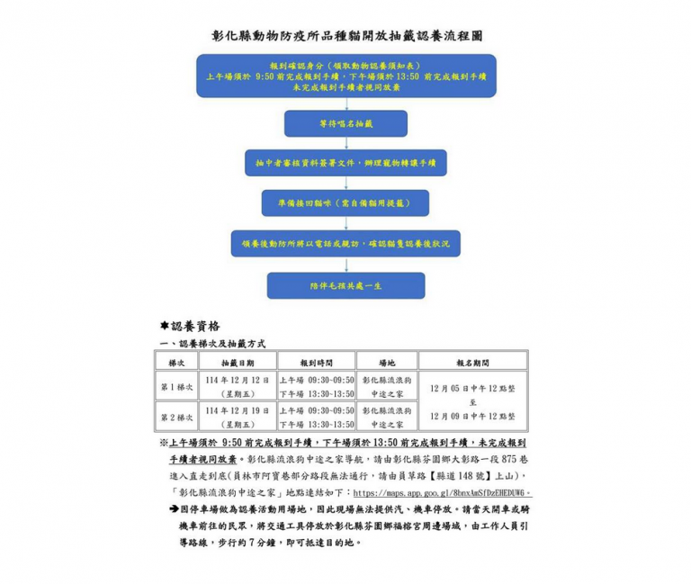 動防所將分批開放二梯次4場次,分別為12月12日及12月19日在彰化縣流浪狗中途之家辦理公開認養作業,當日上午場須於9點50分前完成報到手續,下午場須於13點50分前完成報到手續,未完成報到手續者視同放棄,參與抽籤人員需出示國民身分證正本審核確認是否符合資格始得參與抽籤,如果同一隻貓有多人登記認養,當日將唱名依編號放置籤桶,以公開抽籤方式決定認養人,民眾可至「全國動物收容管理系統」網頁查詢待認養貓隻之照片與基本資料,認養之民眾先至報名網址https://forms.gle/bNCZMpXJ8RfMqnyS8登記報名,每人以登記1隻貓咪為限,詳細報名資訊可至彰化縣動物防疫所最新消息查詢。