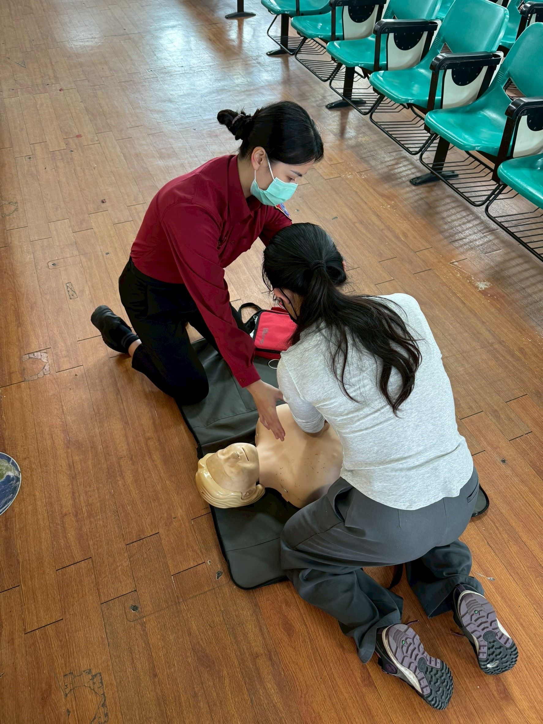 活動過程中,消防人員結合實際案例與現場演練,生動說明各類災害的預防機制。在 CPR 與 AED 的實作環節中,教職員工積極參與、互動熱烈,紛紛針對急救細節向消防隊員尋求專業建議,現場氣氛融洽且充滿學習動力,有效建立起第一線教育人員與專業消防人員之間的良性互動與安全默契。
